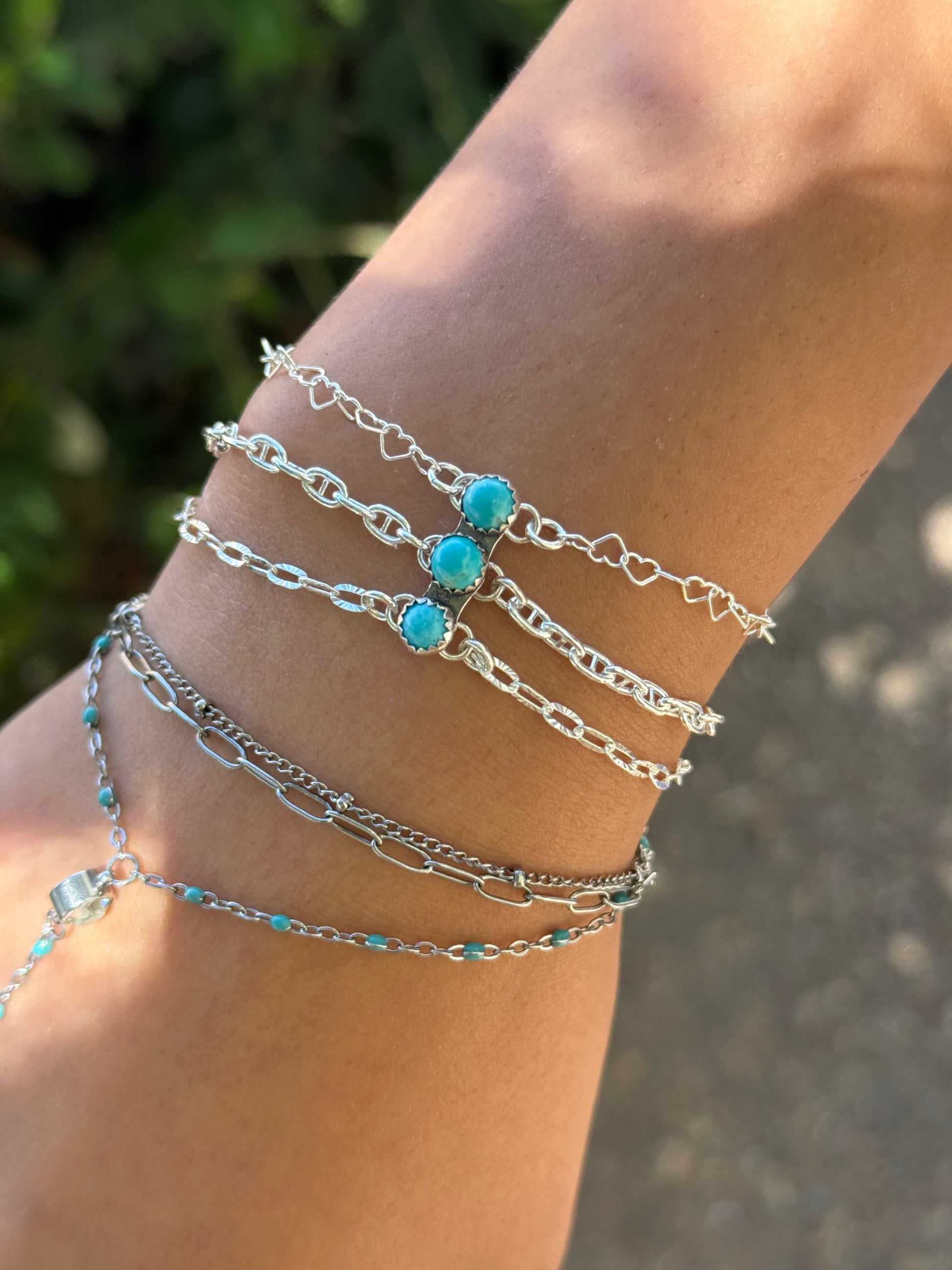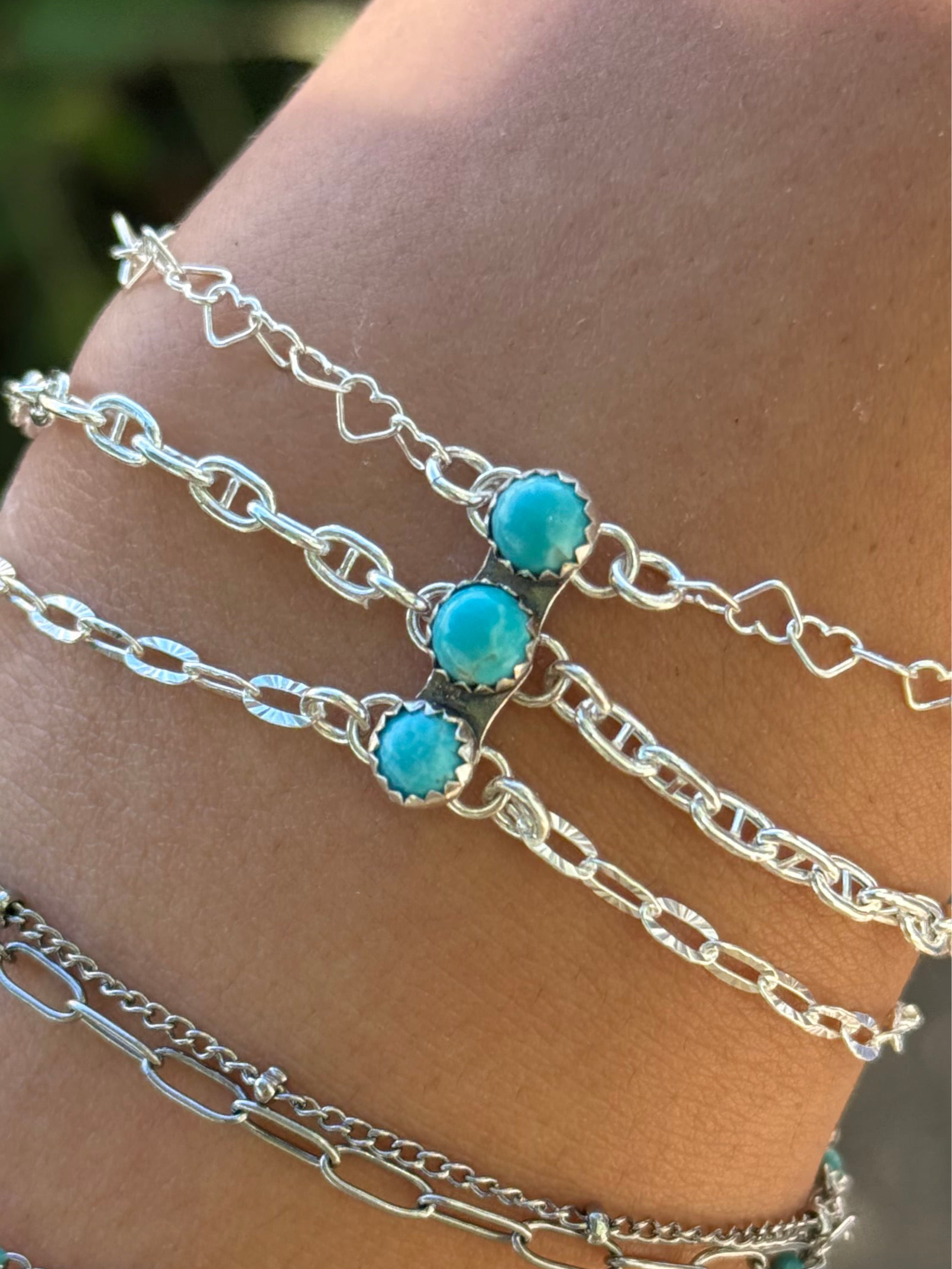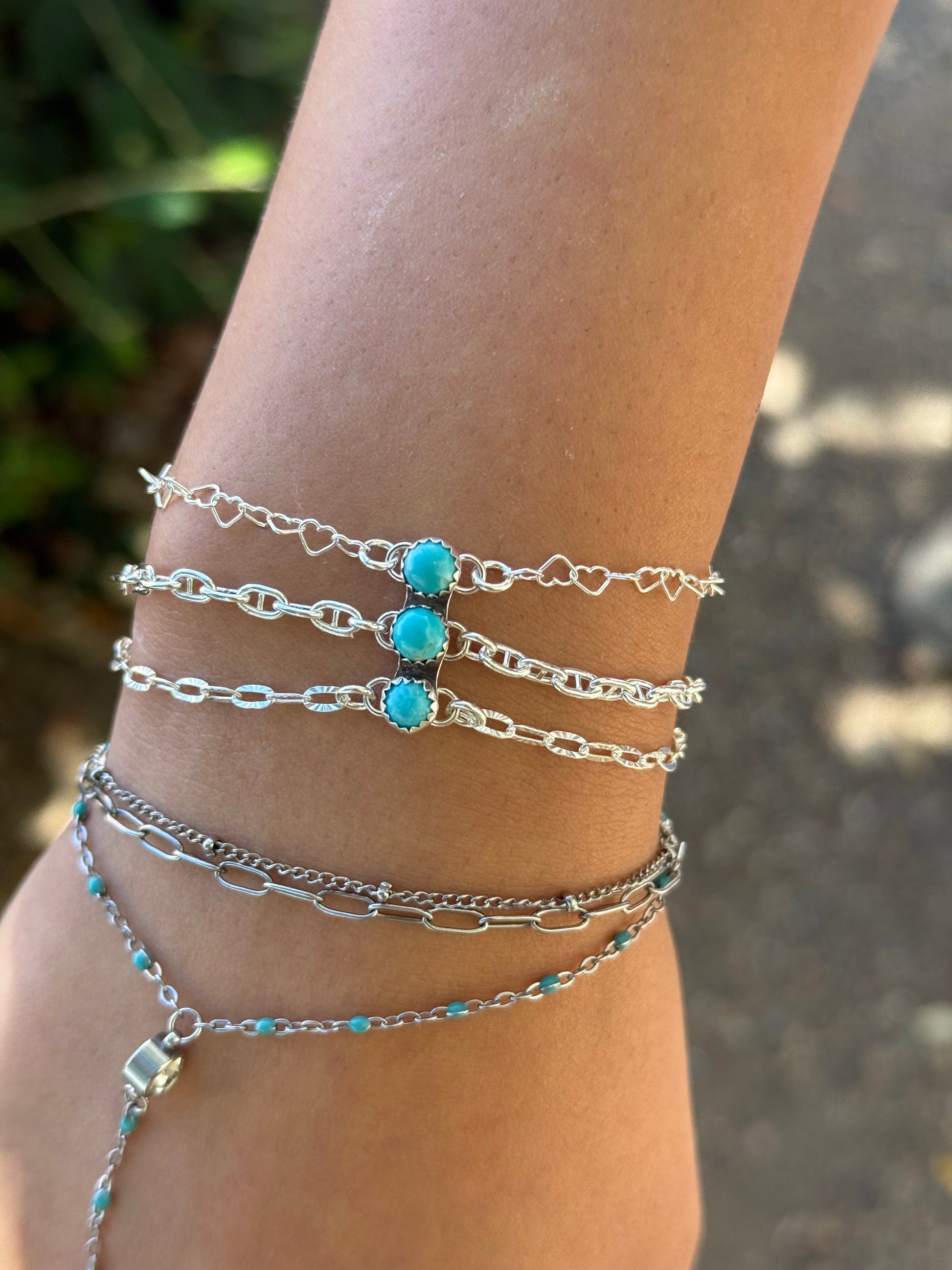 “The OG” Is Our Original Sterling Silver, 3 Chain Anchor, Connector For Permanent Jewelry Featuring 3 Kingman Turquoise Stones.