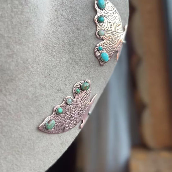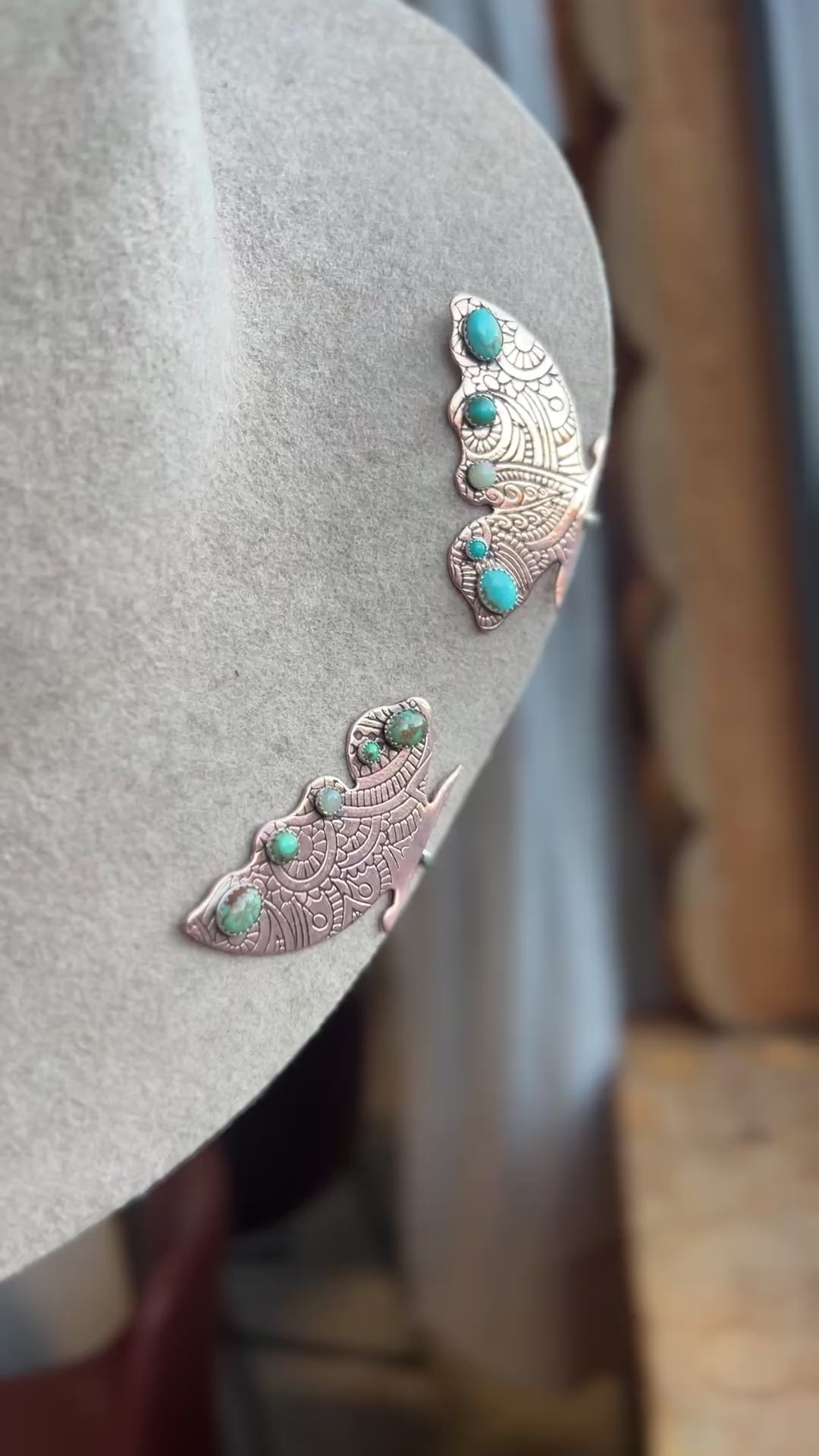 These Copper And Sterling Silver Butterfly Wing Hat Hooks Are A Statement Piece On Any Hat. Textured With A Paisley Design And Embellished With Genuine Kingman Turquoise.