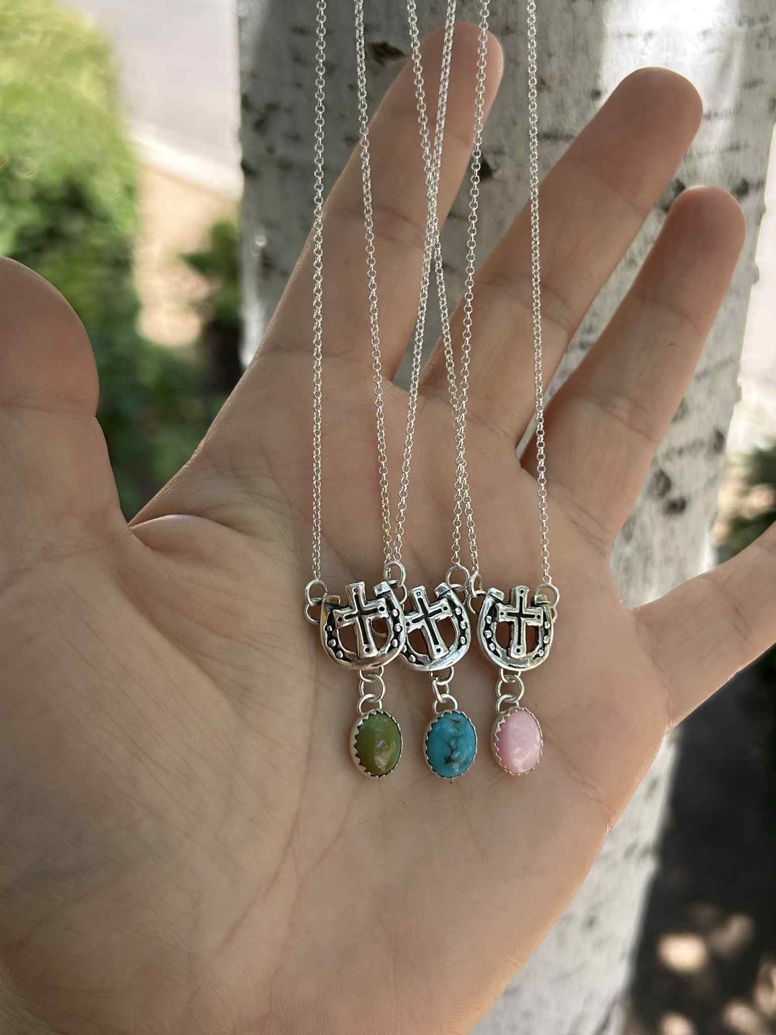 Hold tight to your faith and the freedom of the open range with our Riding with Faith necklace. This meaningful piece features a handcrafted sterling silver horseshoe charm, symbolizing protection and good fortune, with a delicate cross at its center—a reminder of strength and spiritual guidance. Dangling just below is your choice of a 9x7 genuine Kingman Turquoise or soft Pink Conch stone, adding a touch of southwestern soul and feminine beauty. Hung on an 18” sterling silver chain, it’s the perfect everyday necklace for cowgirls who ride with heart and purpose.