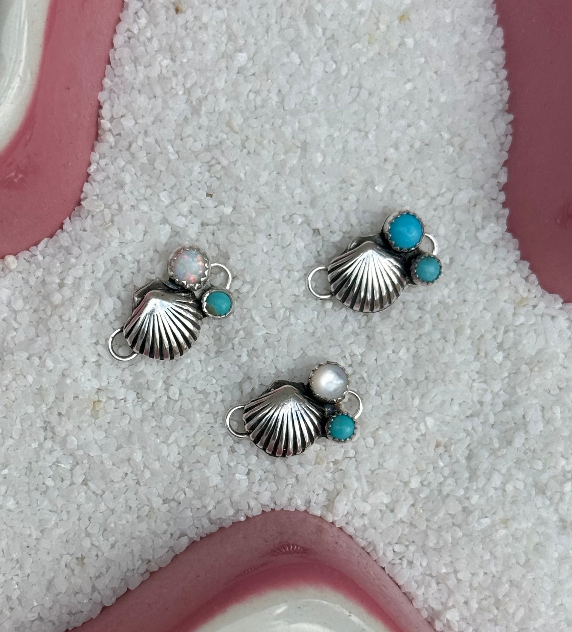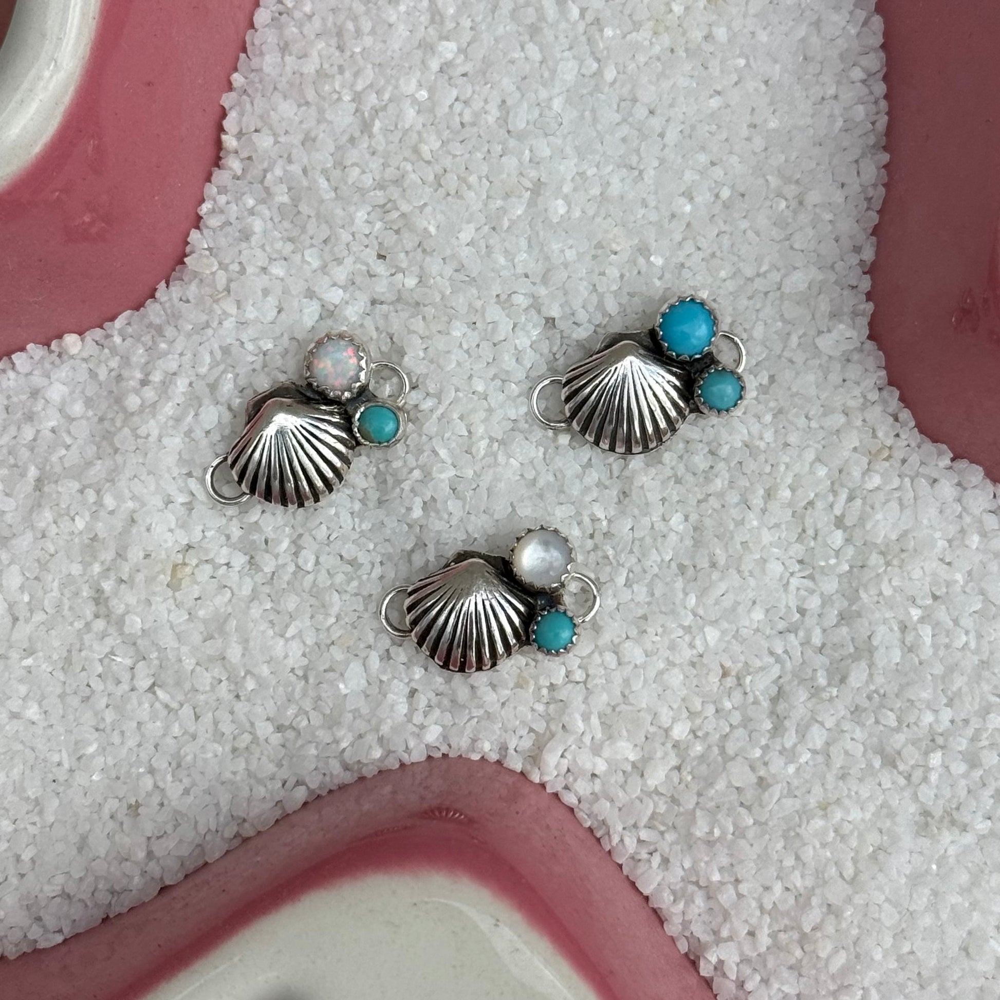 Coastal Cowgirl Series. Sterling Silver Seashell connector featuring 5mm Kingman Turquoise & 4mm Mother of Pearl or 5mm and 4mm Kingman Turquoise